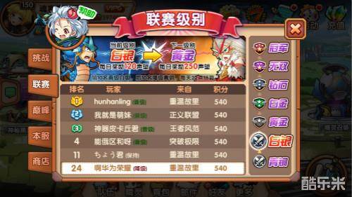 《口袋联盟》冠军联赛规则简介:联赛在玩家等级37级解锁,赛制期间每周举行一次冠军联赛,所有训练师玩家根据积分进行系统排位,每次挑战胜利,训练师即可获得一定积分。系统分为挑战、排行、巅峰、奖励四个界面。更要强调的是训练师在战前可以查看对手的具体布阵及精灵,采用一定策略战胜对手,获得积分。