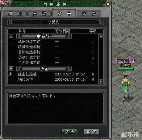 1.在称号界面的称号列表中选定一个称号,点击"激活"按钮,即可显示称号;点击"取下"按钮,则取消当前称号的显示。