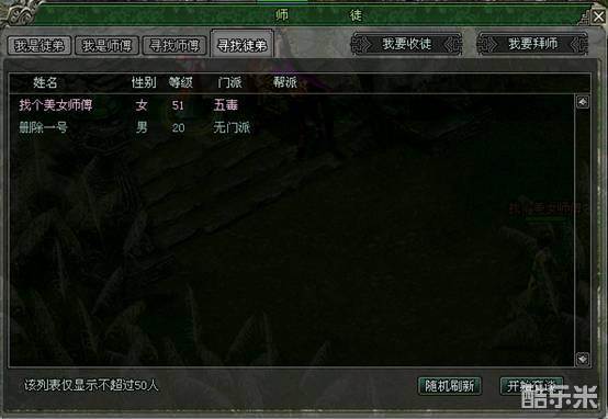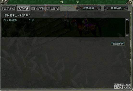 按H键可以打开师徒面板,查询相关信息。必须选中“我要收徒”,其他想拜师的玩家才可以查询到你的信息并拜你为师。否则其他玩家是不能拜你为师的。