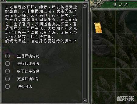 ·师父可以开启师徒传功、查看当前弟子情况和进行师徒传送;