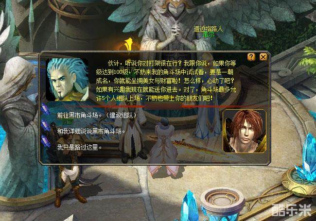 伍德告诉你,黑市角斗场是一个残酷的搏杀之地,故只面向等级达到100级的冒险者开放。并且伍德还给了你一个小小的建议:“角斗场内极为凶险,你最好带上你的朋友们,不超过5个人就行。”