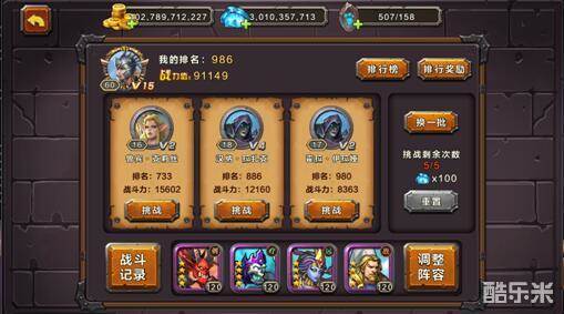 在此竞技场中玩家可以从其他三名排名比自己高的玩家中选择一名进行挑战,点击“挑战”按钮后进入战斗,被挑战的玩家以自动战斗的方式和玩家进行较量,若挑战者胜利,则双方排名互换,若挑战者失败,则双方名次不变。如果玩家觉得当前三名可选挑战玩家实力较强,可以点击“换一批”来更换对手,每天有5次挑战次数。