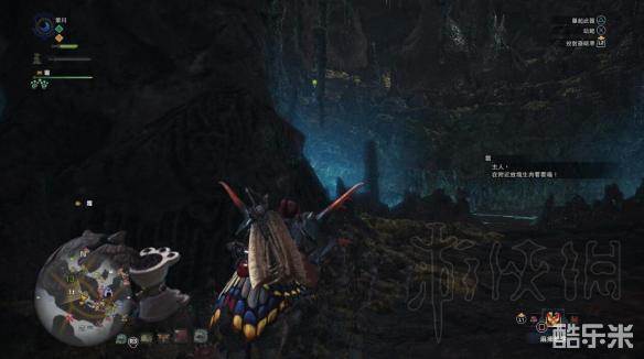 这次是「山谷掠夺族」,达成任务的方法异常简单,不过请带一块生肉放在背包里。在黄色剪头处触发任务,之后跟着引导虫去图中德特尔的位置,猫会跑掉,这时候需要躲起来观察(图二),之后去前面放生肉,再观察一会就可以了。之后随从猫可以驯服凶鄂龙了。