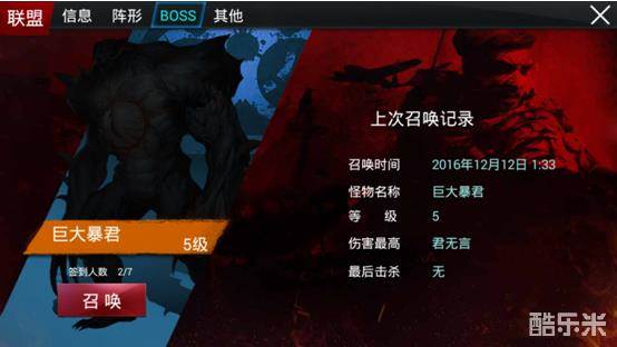 联盟boss作为联盟集体活动,达到召唤条件后,由盟主或副盟主召唤出boss,成功击杀后,不仅可以获取钻石,还有其他丰厚的奖励,赶快团结盟友们一起行动吧!