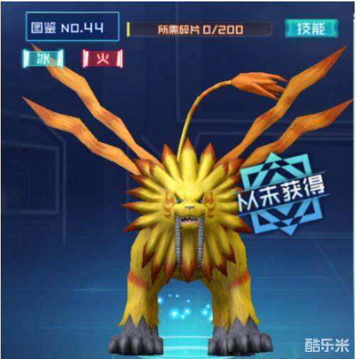 黄金剑狮兽在手游数码兽逆袭中是一枚冰+火系数码兽,主要是火系物理伤害;
