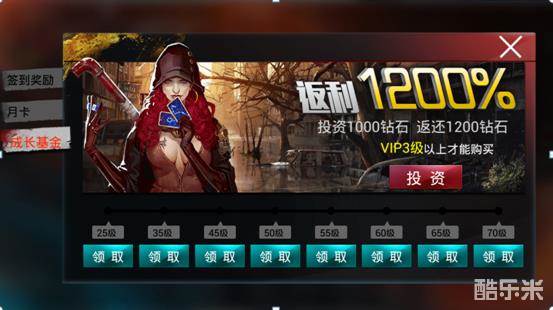 游戏内为各位总督提供了超划算的成长基金!当你VIP等级达到3级以上时,即可花费1000钻石购买,买过之后便可以分等级领取相应的奖励!一直可以领取至70级哦!返利比例高达1200%。除了前期投资的1000钻石,剩下的11000钻都是额外利润,是不是非常的赚?!!