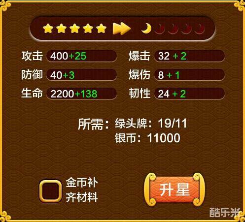 每一张装备卡的下方会有星星月亮等图样,它代表着此张装备卡的星级。星级提升需要绿头牌,当玩家角色达到25级后可开启此功能,而绿头牌通过除妖首次获得一个,开启装备包可获得一个;宗副征讨每个BOSS每天一个;通过副本三星通关有几率掉落。