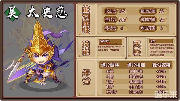 《运筹三国》中根据太史慈弓马熟练,箭法精良的特点,打造了其专属技能矢志强弓,远程输出,其天赋天义使其在回合外进行攻击,让敌人提心吊胆,若配合能补刀的角色,或者武力攻击高的角色,能打出更高的伤害。与其搭配存在缘分效果的武将更能加大杀伤力,其实力不可小觑。