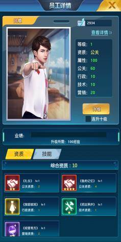 这里的小建议是先把员工等级都升到一百,因为升级到100是只需要用经验来升级的。升级到一百之后就需要提拔员工,可以消耗一定的道具来进行提拔,也就相当于升职,资质越高,为总裁自己增加的实力就越强的哟。