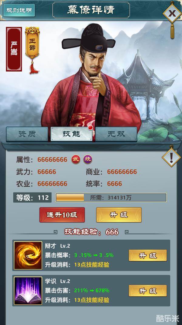2.无论资质多少,任何幕僚由低级升到高级所需银两是一样的,即我用1个亿银两把17资质的李元霸和13资质的程咬金从1升到150级总共所增加的势力,和我用5千万银两把30资质的武汉超所增加的势力是一样的。