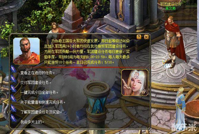 每人每天最多可完成10个建设任务。完成军团建设任务可获得数量不等的个人军团荣誉值和军团物资奖励。每个任务获得的军团物资固定为10份。