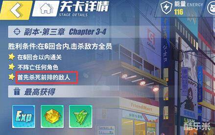 其中有的条件就是首先击杀前排角色,这时候只有指定前排攻击才能够击杀,不然的话,一旦造成其他位置的敌人先行死亡,副本就不能三星通关,对应的奖励也就会减少。