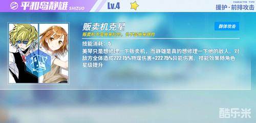 以援护型角色平和岛静雄为例,他的技能效果就是对敌人进行前排攻击,在每次战斗的时候,都会给对应的主战型角色提供一个技能“怪力投掷”。