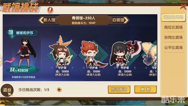 每个不同的段位都有一个馆主守擂人员,并且你需要在自己的比武馆里设置防守阵容以备其他玩家挑战你。