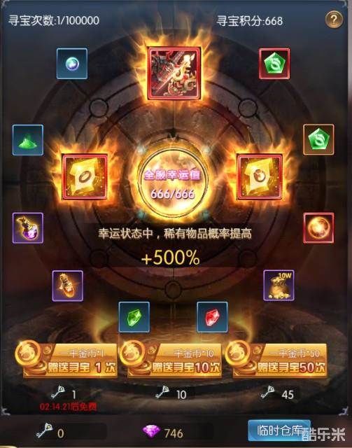 服务器玩家每次寻宝可增加寻宝幸运值,而不同程度的幸运值能提高稀有物品的概率,当有玩家寻宝爆出上述最高奖励,幸运值将会重置,所以我们不妨在全服幸运值最高的时候来拼拼运气~