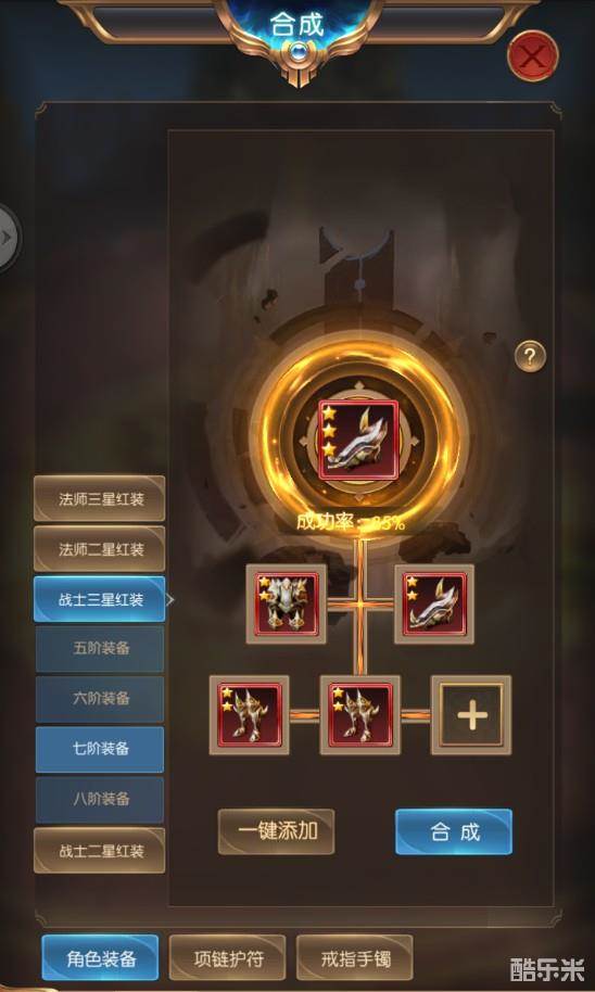 通过装备合成我们可以将橙色二星装备提升至红色二星,把红色二星提升为红色三星装备。所以当我们收集足够的橙色二星装备后,进入合成-装备合成-选择所需合成部位后加入多余的橙色二星装备,进行合成。如果对自己的运气没有信心,可以用5件合成一件高级装备哦,三件合成的概率为75%,4件为85%,而5件合成的概率则为百分百~至于要不要碰碰运气就看各位啦~
