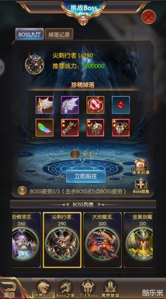 点击boss图标我们可以看见,不同的boss都有机会爆出稀有高级装备,可谓是高级装备的原产地啊。