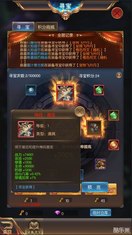 【神兵】、【暮色灵戒】、【暮色灵镯】向来是各职业战神们求之不得的装备之一,七阶的评级使其的属性更为夺人眼球,实属稀缺。众人的寻宝之路不得而返增加了奇迹出现的几率,当全服出现提高500%时,机不可失失不再来,定要好好抓紧此次机会获取强装登顶战神之巅。