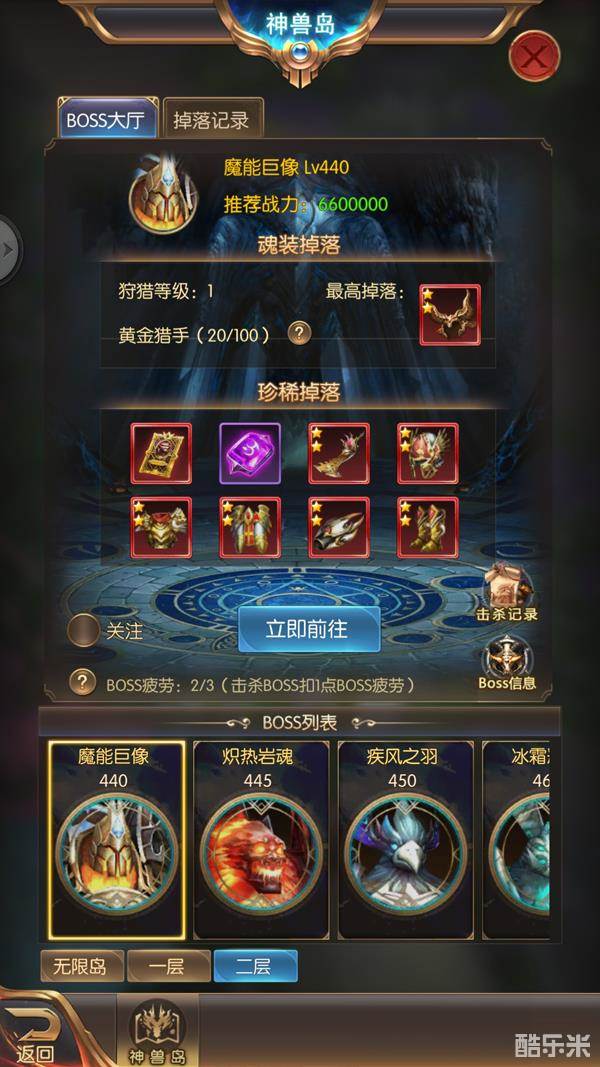 2、 神兽岛无限岛不消耗boss疲劳,击杀一层与二层boss消耗疲劳值,每日上限3点,次日0点重置。