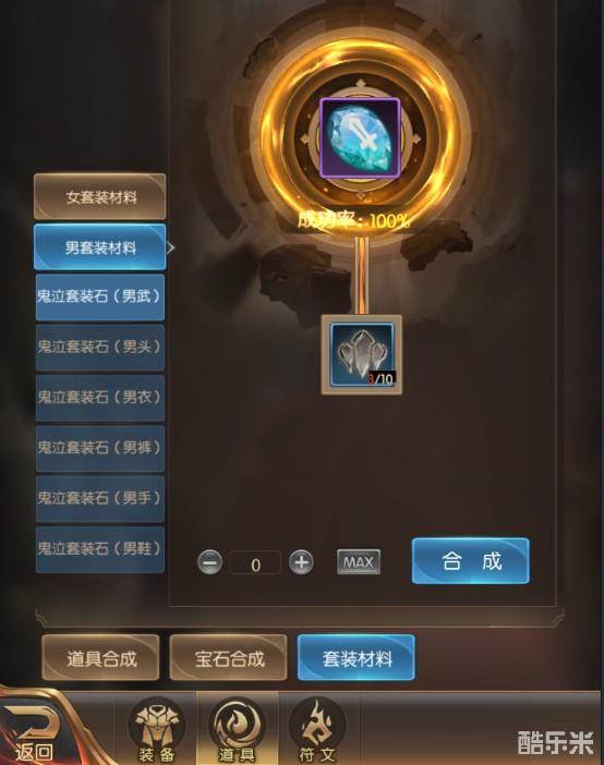 而在合成页面的道具合成-套装材料处可以利用鬼泣套装石碎片进行套装石的合成,合成不同部位装备套装石所需的碎片均不同哦