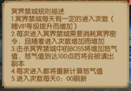 非VIP玩家冥界禁域每天进入限制次数为2次,VIP每升一级,进入的次数加一,以此类推。而每次进入冥界禁域击杀boss都会增加怒气值,当怒气值超过100后将会退出冥界,再次进入会需要消耗次数。