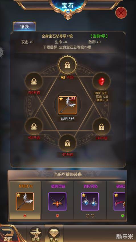 【宝石镶嵌】:得到宝石之后,可以将宝石镶嵌到有镶嵌孔的装备上。镶嵌之后,宝石的属性可以叠加到装备的属性之上。