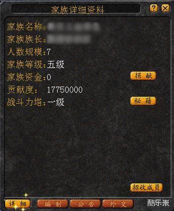点击“军团”按钮,即可弹出家族控制面板。族长的一切权力都可通过这个面板上的功能按钮实现。