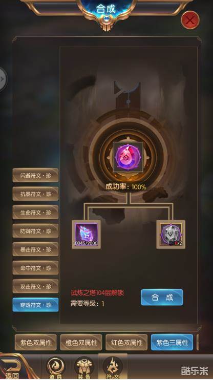 随着通关试练之塔层数的提升,玩家可以佩戴更高级的符文,同时开放更多符文功能,如符文合成。在这里可以通过使用单属性符文合成双属性(精)与三属性(珍)的高级符文。这意味着一个符文槽就能提供两到三中属性的加成!