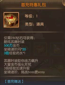 首充特惠礼包,只需要280钻石即可获得更多的奖励,正如它所说提升战力、强化无忧、加速升级,坐骑进阶,一切都so easy。作为游戏偶尔充钱的我现在就像是电竞王境泽:“我就算死外边、也不会看这个游戏的首充奖励一眼”、“哇,这首充奖励真好,真香,赶紧充。”