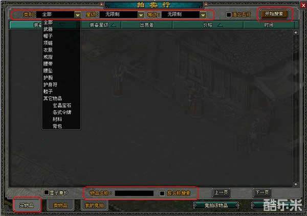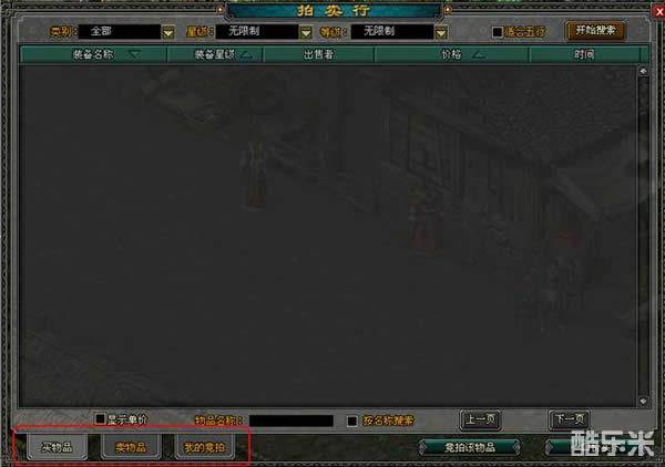 在拍卖行里您可以用搜索栏搜寻你需要的物品,点击左下角的“买物品”,选择好您需要的“物品类别”和“星级限制”后点击“开始搜索”按钮,系统会自动搜索您所需要的。