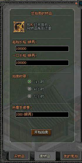 选择左下“卖物品”,打开背包(F2),把你需要出售的物品放上去,标好价格可以选择竞拍也可以选择一口价(需注意如果拍卖价格和一口价相同那么只能一口价买下物品不能参加拍卖),选择好需要出售的时间后,系统会自动计算出售该物品需要的手续费。