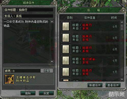 交易成功后,买到的物品或者是收入的银两系统都通过邮件发给您。另外,您每次成功卖买后,都会收到系统发给您的确认邮件(包括竞拍确认),方便您查询。