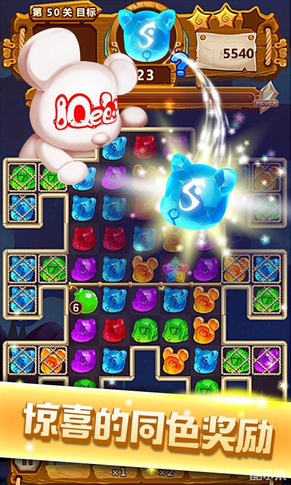 《开心熊消消消》在传统消除的基础上又融合了创新的游戏元素,比如游戏开始前有一段曲折的故事叙述;消除通过闯关的深入,游戏特殊技能可以免费开启;消除特效有直线、辐射、区域等多种炫酷效果。还有宝石颜色不同,爆炸效果颜色也不同哦。每局游戏给你的欢乐都略不尽相同,也许是FEVER的特效惊喜,也许是宝石激爆的爽脆声音,也许是疯狂的连续消除......