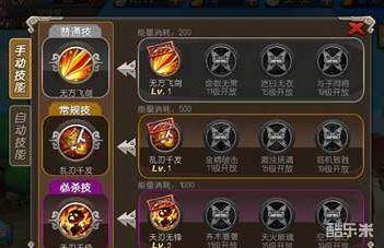 主角的绝技分2类,手动技和自动技。手动技能分普通技,常规技,必杀技三种,是在过关卡和蛮夷之乱这些非PVP战场可以自己手动操控释放的技能,如无方飞剑,乱刃千发,天刃无锋,战斗过程中最先可释放的技能为无方飞剑,消耗怒气最少,其次当怒气积满至乱刃千发处可点击使用,消耗最多怒气的是必杀技天刃无锋。