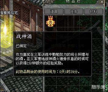 在任务系统中,有些地方任务结束后会获得“战神酒”,找到“战神酒火塘”的附近使用“战神酒”,在“战神酒火塘”附近一定范围内可以持续获得经验。
