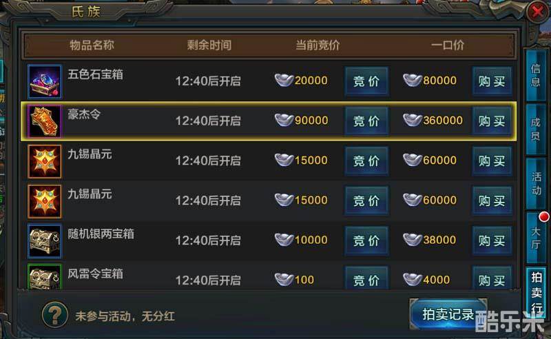 所有的氏族成员都可以参与竞拍,物品是价高者得,价格分为初始竞拍价格和一口价,选择一口价的花费是初始竞拍价的4倍,能够直接购得物品,竞拍成功后物品会通过邮件发放。参与活动的氏族成员都可以获得银两分红,分红的银两总数为当次总拍卖的收入,如果物品产生流拍会按照初始竞拍价格的10%分红,分红与氏族中的职位有关,职位越高分红也越高。