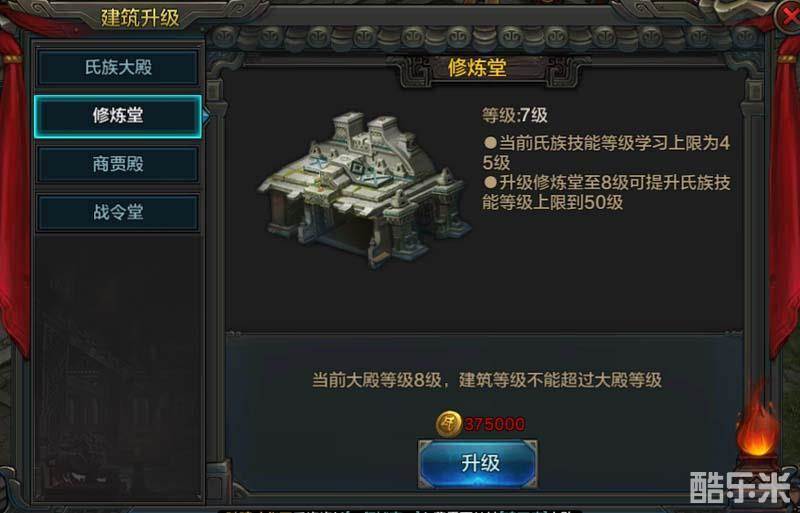 拥有权限的族长和副族长可以对修炼堂进行升级,修炼堂的等级越高升级所需要的氏族资金也越多,修炼堂的等级不能超过氏族大殿的等级。修炼堂升级后可以提升氏族技能的等级学习上限,1级修炼堂可以学习10级氏族技能,每升一级修炼堂氏族技能的等级上限增加5级,在8级时可提升氏族技能等级上限到50级。