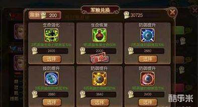 军粮可以兑换很多东西,例如生命强化,生命恢复,防御提升等,如何使用得当军粮,给手下将领加血,加攻,加防,加能量,让你的战士在战场上势如劈竹,所向披靡,就是你作为首领的头等大事!