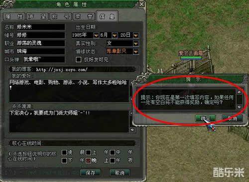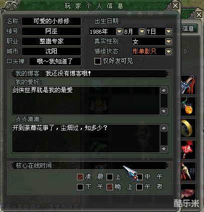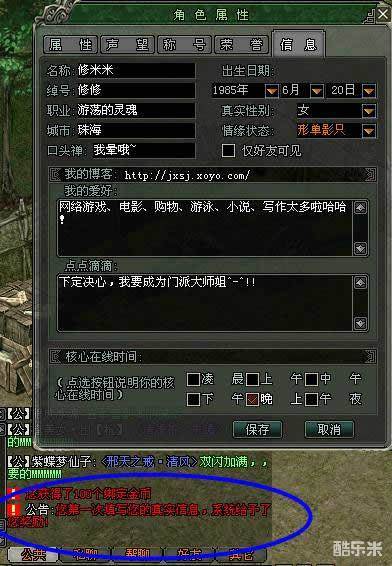 填写的内容包括名称、绰号、出生日期、绰号、职业、城市、情愿状态、真实性别、口头禅、博客、爱好、点点滴滴、核心在线时间等等。