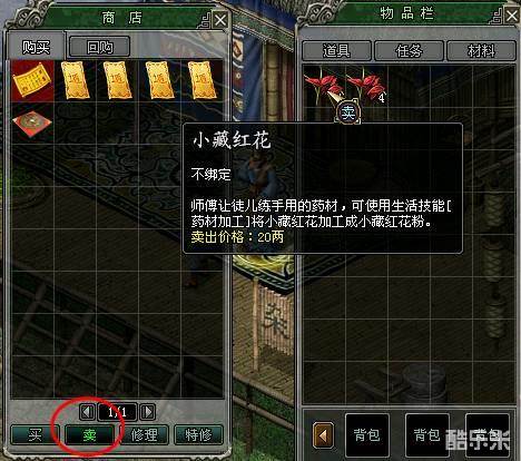 3、出售道具:同样,点击购买界面左下角的按钮“卖”,再点击背包中需要出售的道具即可将该道具卖出。