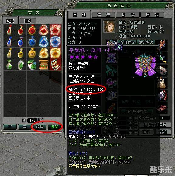 2 、“特修”需要花费少量的银两,并可以修复装备的耐久度上限。