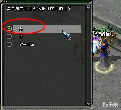 1、首先在新手村或城市找到物品保管员。选择“是”,则记录本次返回点(在野外使用回城符返回的地点)选择“否”,则保留上一次返回点。