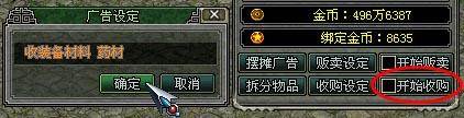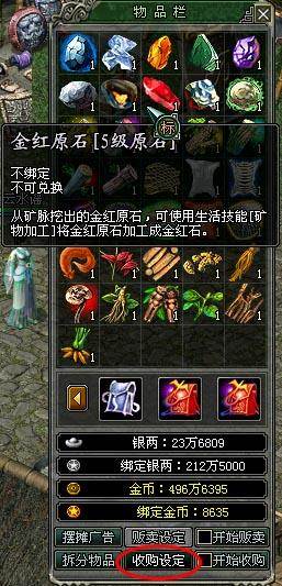 第一步收购设定:点击背包最下方的“收购设定”,带鼠标变成“标”字外观后,点击背包中的物品会弹出收购设定界面。