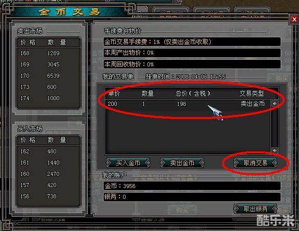 例如,现在的金币交易所的买入市场中有单价220银两的金币200个,你输入以220银两的单价卖出金币30个,那么你的交易便会立刻成功。如果现在买入市场中没有人以220银两的价格收购金币,那么系统会把你的卖出单挂在“我的交易单”中,直到有人以220银两的单价收购金币时,你的买卖单即可交易成功,在交易未成功之前,可以随时点击右下角的“取消交易”,取消你的买卖单。金币交易所挂单时间最长是1周,从挂单那天算起,如果一周内这个单还没交易成功,会自动取消挂单。
