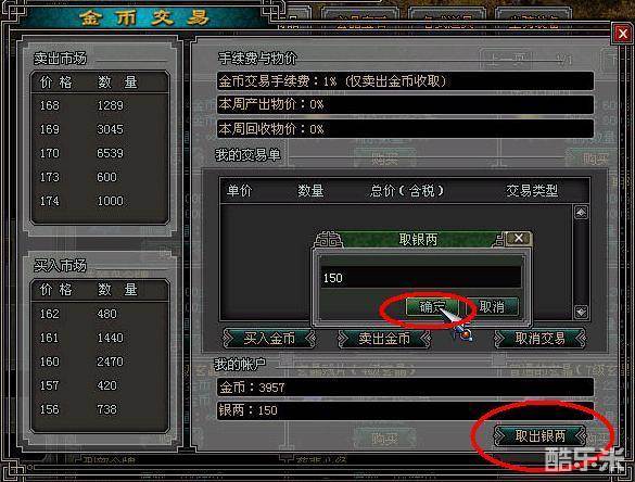 金币卖买单取消后或者成交后,系统会自动将你所退回或者所得到的银两/金币存放到金币交易所“我的帐户”里,点击右下角的“取出银两”,输入你想取出的银两数目,即可将金币交易所“我的帐户”里存放的银两取出。