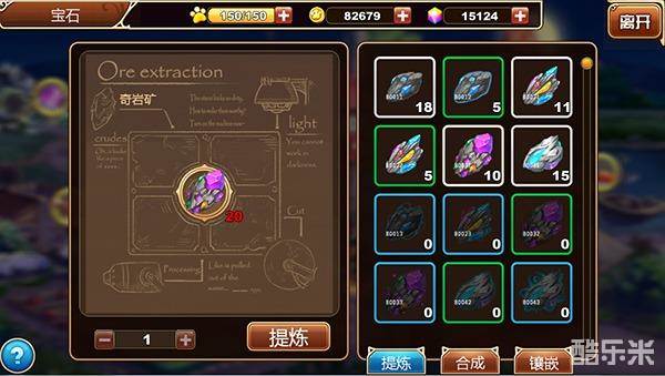 累积足够的原矿后,便可选择原矿进行提炼。每一种原矿都可随机提炼出几种不同的宝石,运气好的时候能提炼出更多的宝石。