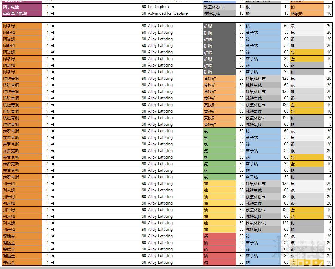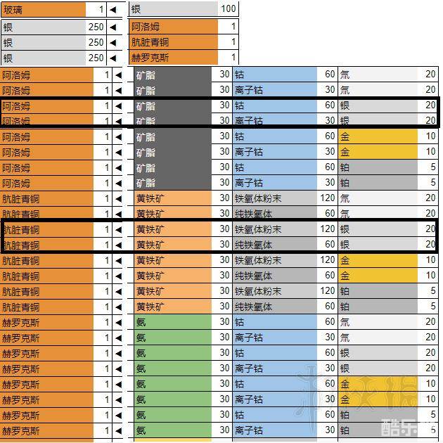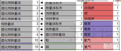 这里推荐1铂+1氧气--》10磁化物铁氧体--》20纯铁氧体,并且正常买东西碰到铂就买吧,毕竟还能烧成纳米星团。