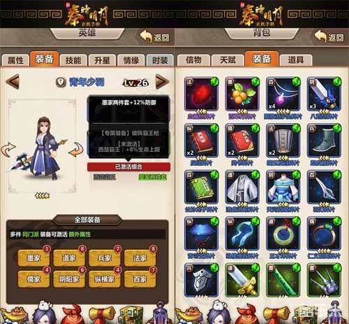 在《新秦时明月》手游中,为了遵从原著,把所有的装备都分为墨家、儒家、道家、阴阳家、兵家、纵横家、法家、百家,这八大势力装备。
