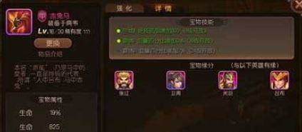 在麻辣英雄中,点击游戏中英雄选项,选择装备-宝物,即可一览所有历代兵法神驹的风采。例如排名第一的神驹赤兔马,古语有云人中吕布,马中赤兔。赤兔马的初始属性为生命增加百分之四,生命增加150,技防增加350。