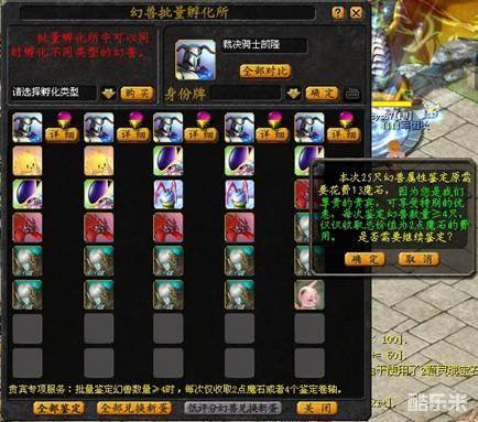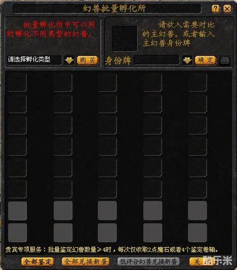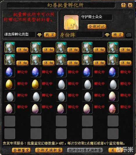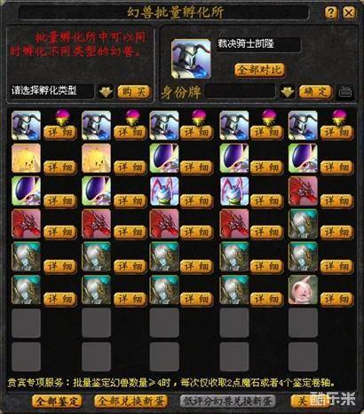 想享受幻兽孵化培育的一站式服务吗?全新的“幻兽批量孵化系统”,将幻兽养成中的鉴定,对比,评分,换蛋服务集于一身,给您更直观更便捷的幻兽养成服务,普通玩家也能充分享受VIP级孵宠乐趣,就在“幻兽批量孵化系统”!